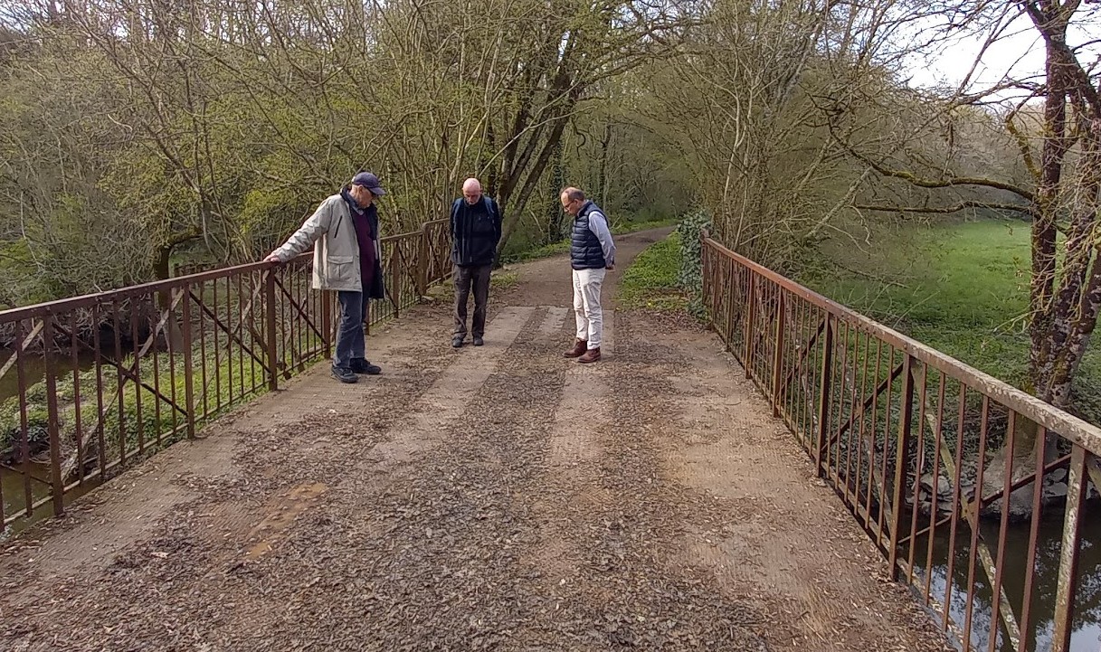Jean Yves Charron de l’association « la ligne de Corcoué », Michel Groisard des « Binots de St Lumine de Coutais » et Jean-Marc Gaillard des « Amis de Legé » sur le « pont de fer » de Corcoué.